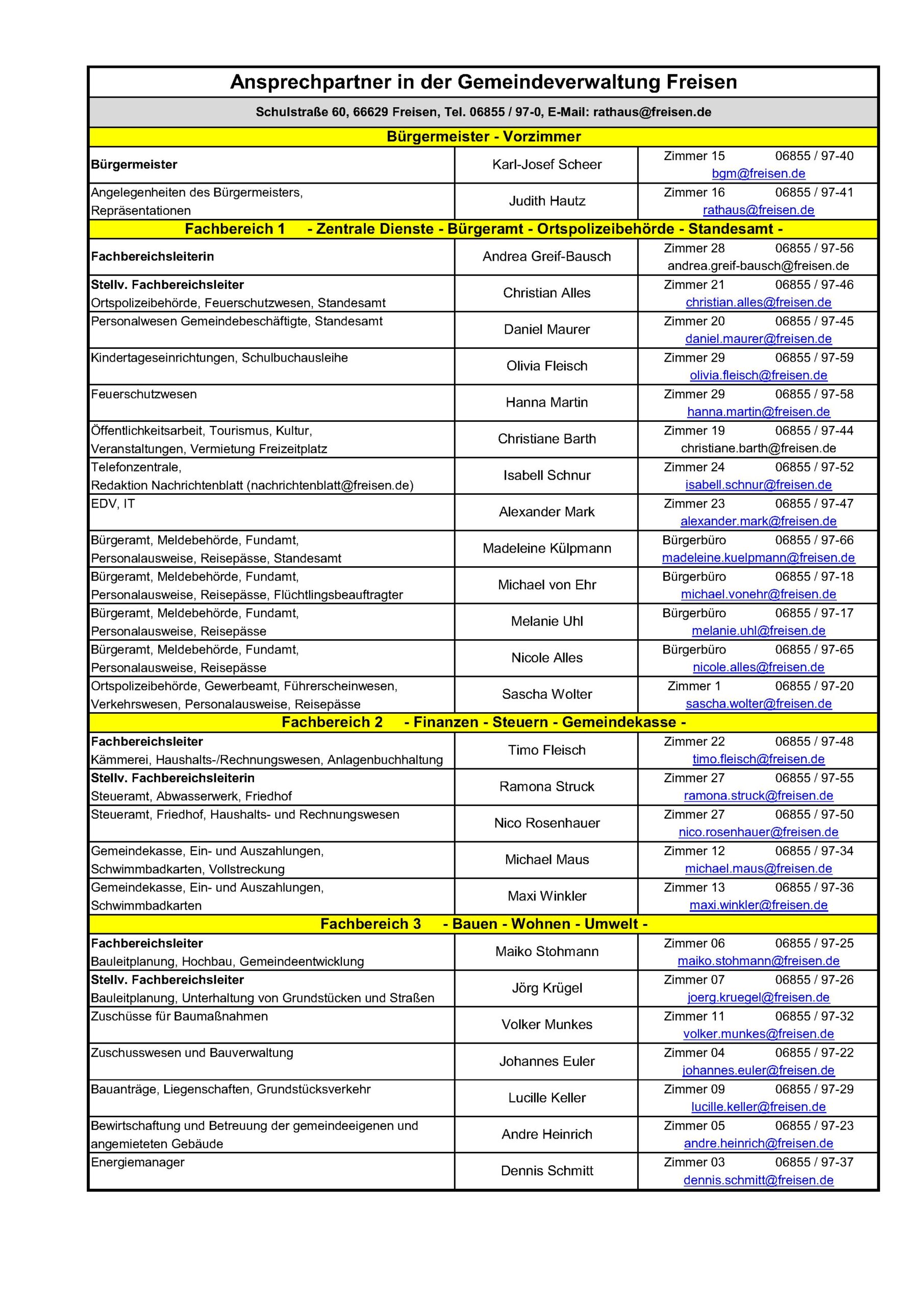 Die Gemeindeverwaltung in Freisen versteht sich als Dienstleister gegenüber ihren Bürgerinnen und Bürgern. Die Mitarbeiterinnen und Mitarbeiter des Rathauses haben stets ein offenes Ohr für Ihre Anliegen. Gerne stehen wir Ihnen für Fragen zur Verfügung. Ich wünsche Ihnen viel Spaß beim Surfen und freue mich auf eine persönliche Begegnung, als Gast oder Bürger.