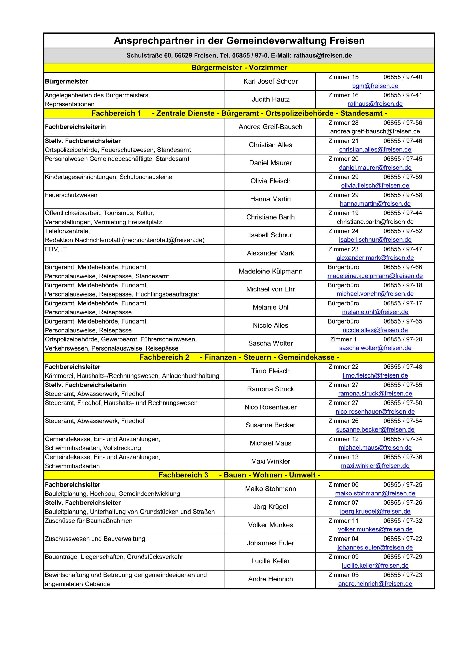Die Gemeindeverwaltung in Freisen versteht sich als Dienstleister gegenüber ihren Bürgerinnen und Bürgern. Die Mitarbeiterinnen und Mitarbeiter des Rathauses haben stets ein offenes Ohr für Ihre Anliegen. Gerne stehen wir Ihnen für Fragen zur Verfügung. Ich wünsche Ihnen viel Spaß beim Surfen und freue mich auf eine persönliche Begegnung, als Gast oder Bürger.